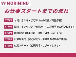 募集背景 業務拡大に伴う製造体制の強化のための増員募集です。生産現場を支える即戦力として、あなたの力をぜひ発揮してください。 仕事内容 自動車のスポイラー部品の製造工場で以下の作業をご担当いただきます。 ◎検査・品質チェック 外観検査(キズ、色ムラ、変形) 寸法チェック ◎梱包・出荷準備 保護材の装着 指定梱包、ラベル貼付 出荷先別仕分けと台車での運搬 大手メーカーとの取引関係で安定した仕事量です。 丁寧に指導しますので製造未経験の方でも大丈夫です。 __________________________________ 【勤務地】 岩手県北上市相去町 【求人発行元】 宮城県栗原市築館青野8-10 株式会社モリマインド ◆ご応募前のお仕事相談もOK! ◆正式応募の前の職場見学もOK! ◆北上エリア担当者が対応いたします。 [こんな人が活躍] ※周囲と協力してお仕事ができる方 ※わからないことを素直に質問できる方