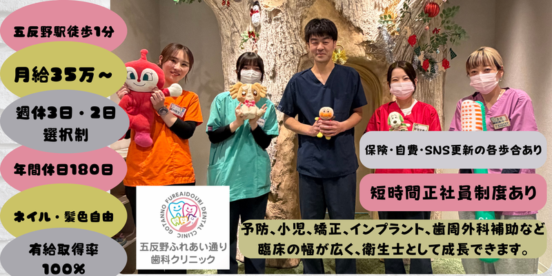 求めている人材 《要歯科衛生士免許》 経験者の方は優遇いたします。 これまでのご経験を活かし、担当制のメンテナンスや自費治療補助など幅広い場面で活躍していただけます。 若手や経験が浅い方も、先輩スタッフがしっかりサポートしますので安心してスキルアップを目指せます。 【特に歓迎します】 ・臨床経験がある方 ・予防中心の診療に携わりたい方 ・矯正・インプラント・歯周外科などにも関わりたい方 <こんな方もぜひご応募ください> ・ブランクがあるけれど復帰したい方 ・若手で経験を積みたい方 ・週休3日が希望の方 ・有給取得率100%の職場で働きたい方 ・ネイル・髪色自由な環境を希望される方 ・Wワークや時短勤務も視野に入れたい方 ・駅近の職場で働きたい方