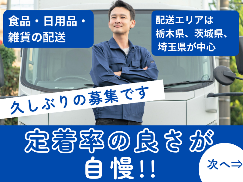 仕事内容 <4t配送ドライバー> 会社創立以来、着実に業績を伸ばし続け、 安定成長を遂げています。 新規の顧客も増え、 これから車の台数も増やして行き、 さらなる発展を目指して 社員一丸となり頑張っています。 【食品・日用品・雑貨の配送】 商品の荷積みから配送を行って頂きます。 配送エリアは栃木県、茨城県、 埼玉県を中心とした近郊地です。 まずは先輩に同乗して仕事の流れを 覚えていくので安心です。 20~50代のスタッフ活躍中。 長期で活躍できる職場です。