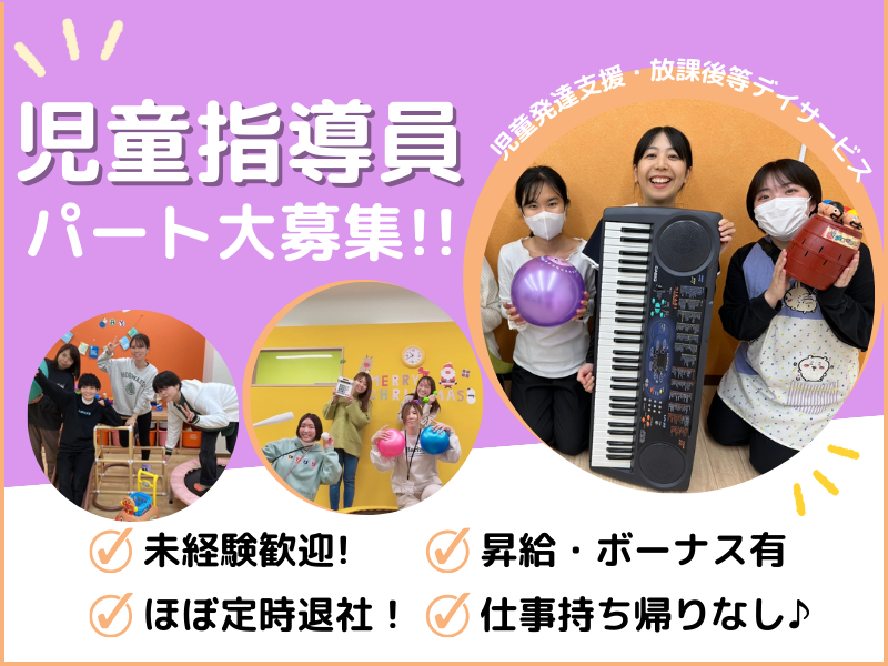 仕事内容 児童発達支援・放課後等デイサービスにて 「児童指導員」の方を募集しております! 〇週2日~OK 〇1日5h~OK 〇即日入社OK 〇未経験歓迎・ブランクOK! ✅時短勤務・入社時期相談可能 ✅未経験歓迎ブランクOK! ✅残業ほぼなし人間関係良好です!(延長保育なし/送迎率ほぼ100%でお迎え遅れによる残業もなし) ✅企業主導型で少人数の児童をお預かりします(1日10名程度を4~5名の職員が対応します) *★一日の流れ(例)* ★平日午前 9:00 朝礼(申し送り・役割・プログラム確認等) 9:20 未就学児の送迎 10:00 健康状態の確認、連絡帳の提出等 10:30 朝の会 10:40 小集団プログラム、個別支援等 12:40 帰りの支度、帰りの会 13:00 帰りのご挨拶、帰りの送迎 ★平日午後 14:30 学校送迎 14:40 おやつ・宿題・課題・自由遊びの時間 16:40 帰りの支度、帰りの会 17:00 ご挨拶、送迎 18:00 終業 帰宅 ★「こぱんはうす さくら」は 発達や成長に心配のあるお子さまや、 障害のあるお子さまを対象とした、 児童発達支援・放課後等デイサービスの事業所です。 *◇主な業務内容* ・個別支援計画に基づいたお子さまへの療育提供 ・活動準備、指導記録の作成 ・送迎 など ★学習やソーシャルスキルトレーニング(SST)、 音楽、運動…など様々な活動の中で、 たくさんの「できた!」の体験を積み重ね、 少しずつ社会性を身に付けてもらいながら、 仲間と共に成長できるよう支援をしています。 *◇活動の例* 音楽〉音楽療法 運動〉運動トレーニング 料理〉おにぎり、ホットケーキ、ゼリー 制作〉ちぎり絵、季節の壁面制作、フィンガーペイント お出かけ〉公園でピクニック、川沿いをお散歩 *★運営教室ナンバーワン!* こぱんはうすさくらは、 児童発達支援・放課後等デイサービスの教室を 全国で100以上展開している大手です。 弊社は運営代理店として 最多の運営教室数を誇っており、 大手ならではの安心感と教育制度があります。 *★お子さま一人ひとりと向き合える!* お子様2人に対して職員1人配置のため、 一人ひとりの個性と向き合って 成長を見守ることができます! プログラムは教室スタッフみんなで企画提案をしたりと、 活動的で明るい施設運営を心掛けています。 *★キャリアアップ可能* 「将来的には管理者になりたい」 「自分で教室を運営したい」 そんな夢を持っている方も大歓迎です! 私たちと一緒に経験を積んで、 スキルアップしませんか? *★ご経験は問いません。* OJT研修で先輩職員が丁寧にサポートします! ★集団療育、個別療育ともに力を入れており、 療育だけでなくイベントも毎日行うことで 教室に来て「楽しい!」と思っていただける 教室作りを心がけております。 ★職員全員でより良い教室をつくっていけるよう コミュニケーションを大切にしています。 お子さまやご家族の気持ちに寄り添って支援をしたい方、 職員みんなで教室をつくっていきたいという 思いがある方をお待ちしております! ☆下記教室でも募集中です! ❇こぱんはうすさくら草加八潮教室