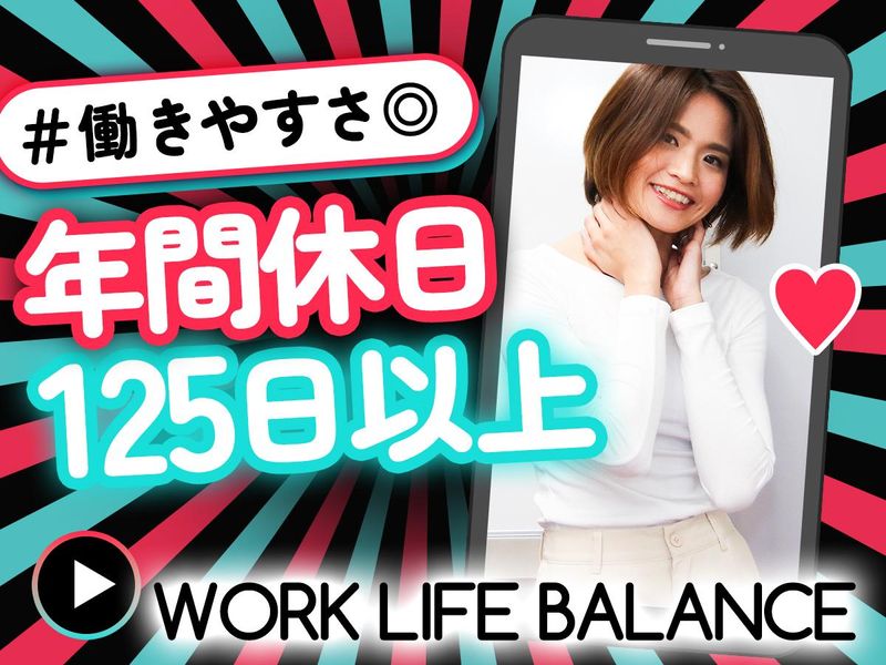 職場環境 【メンバー構成】 ●男女比5:5 ●20代前半~30代が中心 ●約90%が未経験スタート! 【待遇面】 ●年間休日125日以上 ●完全週休2日制×土日祝休み ●残業月平均10日以下 ●服装自由 喫煙所:なし(敷地内全て禁煙)