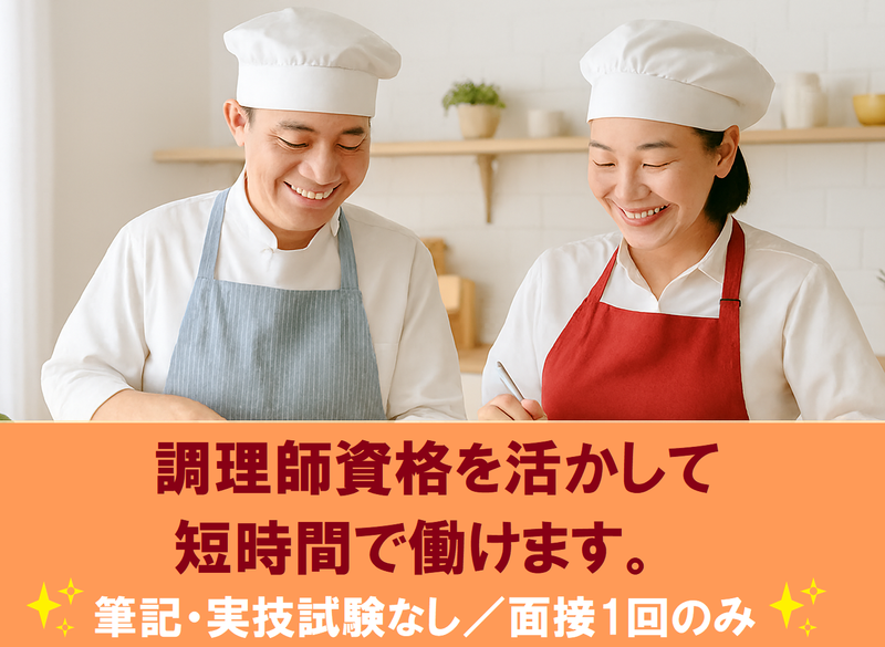 求めている人材 ⭐調理師資格をお持ちの方 ⭐調理実務経験ある方(年数不問/ジャンル不問) 飲食店のキッチン・保育園・学校給食・社員食堂・病院給食などの経験者歓迎 ●ブランクOK ●在職中の方の転職歓迎 ***✨ こんな方ぜひ ✨*** ・朝型で、午後はゆっくりしたい ・資格を活かして無理なく働きたい ・高時給の副業を探している ・休みが取りやすい安定企業で働きたい