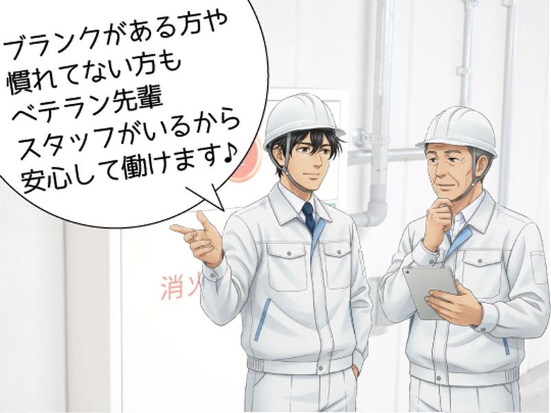 求めている人材 ■─────────────■ 以下のいづれかの資格をお持ちの方 は優遇いたします。 ■─────────────■ ◎第一種電気工事士 ◎電験三種 ◎二級ボイラー技士 ◎甲種危険物取扱者 ◎乙種第4類危険物取扱者 ◎防災センター要員 ■─────────────■ こんな経験が活かせます! ■─────────────■ ◎ビル設備管理/施設保全/ 空調点検・メンテナンス/修繕対応/ 顧客対応/施設管理/公共施設 ■─────────────■ ミドル・シニア世代も活躍中 ■─────────────■ 50代60代の方も多数在籍しています。 これまでの経験をいかしてイキイキと 活躍されています。 「もう一度現場復帰したい」 「長く働ける職場を探している」 という方に最適なお仕事です。
