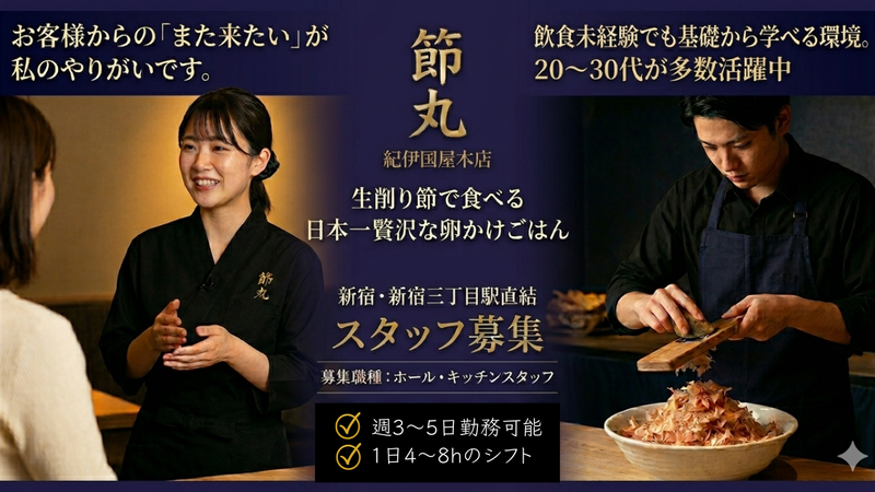 仕事内容 〝生削り節で食べる日本一贅沢な卵かけご飯″をコンセプトに、 定食(御膳)や中華そばを提供しているお店です。 テレビ番組やSNSでも取り上げられる、話題の新店舗です✨ 食券制のためレジ対応は基本なし。 飲食未経験の方でも始めやすい環境です♪ 【仕事内容】 ホール・キッチン業務をお任せします。 難しい作業はなく、未経験の方でもすぐに覚えられる内容です◎ ■ホール業務 ・お客様のご案内 ・食券の受け取り ・料理の提供 ・店内清掃 ■キッチン業務 ・食材の準備や仕込み ・料理の盛り付け ・食洗機の管理 ・一部洗い物 最初は簡単な盛り付けや仕込みなど、 できることから少しずつお任せします♪ ✨Point✨ ・駅直結で天候に左右されず通勤ラクラク ・落ち着いた雰囲気のおしゃれな店内 ・未経験者歓迎 ・食券制なので基本的に現金の取り扱いなし