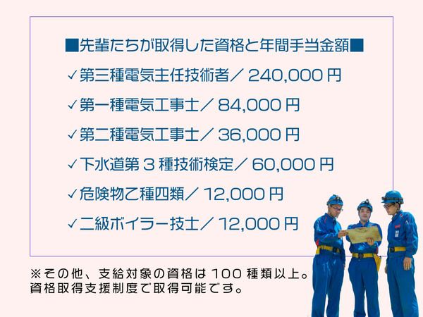 月給203,000円~265,000円 給与 月給203,000円〜265,000円 ※上記は、今回募集の最低月給です。 ※下記資格手当などは別途支給されます。 ※下記月収例も参考にしてください。 【昇給】 年1回 【賞与】 年2回 ※2024年度実績:3.5ヵ月分 【手当】 ・家族手当 ・深夜勤務手当 ・資格手当 第三種電気主任技術者/20,000円 第一種電気工事士/7,000円 第二種電気工事士/3,000円 下水道第3種技術検定/5,000円 危険物乙種四類/1,000円 二級ボイラー技士/1,000円 ※入社5年目:月額平均23,000円 ※入社10年目:月額平均36,000円 ※その他、支給対象の資格は100種類以上。資格取得支援制度もあります! 【給与例】 【給与例】 年収400万円 経験3年 /月収27万7000円(資格手当+家族手当)