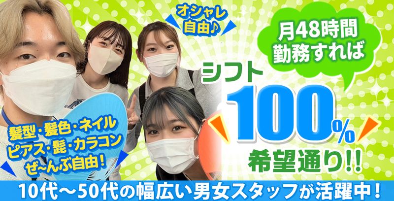 シフト制 勤務時間 ■9:00~24:00 上記の間で1日4時間~ ※20時~22時は2時間でもOK (月トータル48時間以上になれば可) シフトについては月に1度お伺いします。 ▼シフト例 ・18:00~22:00を週1.2日で、週末は12:00~19:00 →「学校終わり高校生の場合」 ・9:00~14:00で平日のみ勤務 「家庭と両立して働きたい方」 ・15:00~24:00で週5日勤務 「ガッツリ稼ぎたい」フリーターさん ・10:00~15:00で平日週4日勤務 土日祝休みたい主婦(夫)さん ・午前中の2時間・授業部活終わりの20時~22時 すき間時間で稼ぎたい近所の学生さん 近所の方は、お昼は自宅に一時帰宅して、ゆっくり休憩してから再度働いている方もおります! などなど働き方は本当にあなた次第です☆ 就労期間:長期勤務できる方 下記のような方もOKです。 1年後に留学予定がある為、1年だけ働きたい! 半年後に結婚を控えている為、取り急ぎそこまで働きたい。 夏休みだけ短期留学がある為、夏休みだけ1か月休みたい etc...