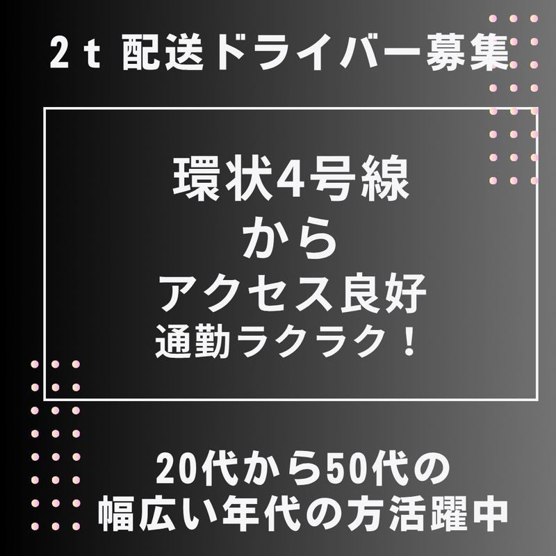 仕事内容 【入社・勤務開始日応相談】 <建築資材(断熱材)配送 2t 配送ドライバー募集> 建築資材(断熱材)の配送をしていただきます。 配送件数は4~5件程度(コースによる)も少なめです。 ~1日の流れ~ ・6:30 車庫出発 ・8:00 現場に到着荷物を下ろして次へ出発 午前中に3件配送 ・12:00 お昼休憩 ・13:30 次の配送先に到着、午後に2件配送。 ・15:00 センター到着、翌日分の荷物を積み込み ・16:30 車庫帰着、報告および次の日の配送確認後業務終了 ●創業30年の安定企業で長期安定して勤務可能 ●中型免許がある方ならば未経験もOK ●AT限定免許可 ●月収32万円以上も可能 ●経験者の方は即戦力として月収アップも可能 ●配送件数もすくなめ(10件程度) 【株式会社サンライズ】 株式会社サンライズは、1995年の創業以来、神奈川県をメインに配送している運送会社です。現在、30台※を超える車両を使用し、酒類や建材・生活雑貨・食品類など幅広く配達している会社です。 運送業界のイメージアップを目指し、「笑顔のあいさつ」をモットーにスタッフの笑顔が増えるよう労働環境を改善するよう取り組んでいます。私たちサンライズで一緒に働いてみませんか。ご応募お待ちしております。 ※保有車両:70台(4t/3t/2tL/2t/1.5t)(2024年7月現在)