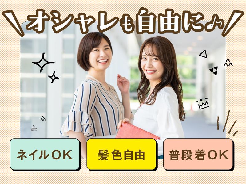 【保険制度】 雇用保険、労災保険、健康保険、厚生年金 待遇・福利厚生 【福利厚生】 ネイルOK 髪色自由 服装自由 扶養内勤務OK 社会保険完備(法令) 交通費全額支給 研修制度充実 服装自由 休憩スペースやお昼を食べる場所あり 冷蔵庫使用OK
