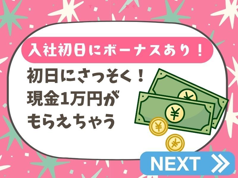 アピールポイント: /\/\/\/\/\/\/\/\/\ 入社時の特別支給「サクッと1万」開始 \/\/\/\/\/\/\/\/\/ 入社初日に「入社特典」をゲットしよう! 配属されたその場で「現金1万円!」 気になったらお気軽にお問い合わせください! *残業ほぼなし・土日祝休みでオフ充実* * 未経験OK * 女性活躍中 * 日勤のみ・土日祝休み * 残業すくなめ * 親切なスタッフがお仕事をサポート * 座り作業中心 * 自転車・バイク通勤OK * 作業服貸与 <日払い・週払い利用OK> \まるで毎日が給料日/ \\利用者急増中// \アプリで簡単申請/ お気軽にご相談くださいね!