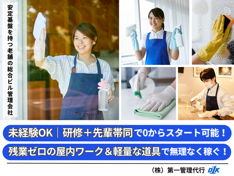 仕事内容 【この求人のポイント】 ①未経験歓迎: 研修+先輩帯同で基礎から丁寧に習得。 いきなり一人現場はありません。 ②残業なし・定時退社: 担当エリアと標準化された手順が決まっており、 “勤務時間内に終わる”を徹底。 ③年齢不問(20〜50代活躍): 役割分担とチーム運用で年代・性別問わず活躍できます。 ー 【業務内容】 日常清掃(共用部): ・廊下/トイレ/待合などをモップやクロスで拭き上げ ・ゴミ回収 病室まわりの清掃: ・ベッド周り/床/手すり/ドアノブ等の拭き掃除と消毒 消耗品の補充: ペーパータオル/石けん/トイレットペーパーなどを定期補充 定期清掃のサポート: ワックスがけ/機械洗浄の準備・片付け ※最初は機械操作は先輩が担当、安全確保とエリア案内を担当 連絡・報告とシフト勤務: 破損・汚れの“気づき”を共有し、作業終了を報告。 ☆屋内業務で、雨風に打たれることなく、空調完備の最適な環境で業務に携わります! 重いものを運ぶこともなく、身体的にもメンタル的にも安定して長続きする環境です! ー 【会社概要】 株式会社第一管理代行は1966年に東京都千代田区で創業し、総合ビルメンテナンス企業としてマンション管理、清掃管理、医療関連、設備運転保守、保安警備まで一気通貫でサービスを提供してきました。 半世紀を超える運用ノウハウを背景に、リーマンショックやコロナ禍でも、現場の継続稼働と快適性向上を両立することで、堅調な成長を実現してきました。 ー 【当社で働く魅力】 1|なぜ定時で帰れるのか? ・担当エリアが明確: 共用部・病室など担当範囲と順路を事前に計画。 ・標準化された清掃: 手順書やチェックリストで判断時間を短縮。 ・前倒し計画:定期作業や消耗品補充は余裕を持って組み、駆け込み残業を防止。 2|“カラダに優しい”屋内ワーク 空調の効いた屋内業務。 軽量モップ・カート・伸縮ポール・キャスター付きバケツなど、負担を減らすために、軽量なモップなどの道具を標準装備。 年齢や性別に関係なく、長く続けられるコンディションをキープできます。 3|“17時前に上がれる”から、夜が自由になる シフトは7:00〜16:00(実働8h)。 夕方以降は家族の夕食、通院、趣味や学びの時間に充てやすい。 都心・飯田橋だから、16時台に上がっても寄り道の選択肢が豊富。 生活のリズムを整えながら、無理なく働けます。