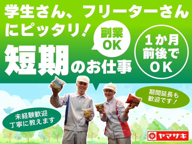 仕事内容 ラベル貼り付け・パック詰め・仕分けなど 初めての方も安心のカンタン作業です。 <冬・大増員> <期間>面接翌日~2月末まで 期間内で1ヶ月前後の短期勤務できる方大募集! 希望日を気軽にご相談ください! 日数の延長や長期への変更も歓迎! 国内トップクラス食品メーカー「ヤマザキパン」だからこそできる、 働きやすい環境が整っています。 未経験の方でも安心してスタートできるように 丁寧で細やかな作業説明があるのはもちろん、 困ったときはすぐに先輩スタッフや社員がフォローできる体制です。 また業界をリードしていく大手メーカーとして コンプライアンス遵守を徹底していますので、 安心して長期で働いていただくことも可能です。