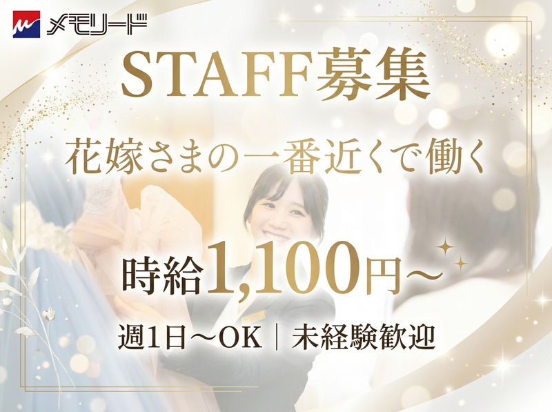 求めている人材 この仕事は、華やかさの裏側で“そっと支える”役割。 でも実は――一番近くで感動を見られるポジションです。 誰かの大切な1日を、自分ごとのように大事にできる方を求めています✨ ⏩ 土日祝+平日も勤務できる方歓迎 ⏩ 週1日~OK(学業・家庭・Wワーク両立可) ⏩ 未経験歓迎(9割が未経験スタート) ⏩ 人の幸せを一緒に喜べる方 ⏩ 「ありがとう」にやりがいを感じる方 ⏩ 丁寧で落ち着いた対応ができる方 ⏩ 気配りや小さな変化に気づける方 ⏩ 立ち仕事・移動サポートに抵抗がない方 ⏩ 接客マナーや所作を身につけたい方 ⏩ 将来に活きる経験を積みたい方 ⏩ “ここでしかできない経験”をしたい方 ただのアルバイトじゃない。 自分の価値を少し上げたい人に向いています。 やりがいも、成長も、感動も。 全部ほしい人、待っています❗