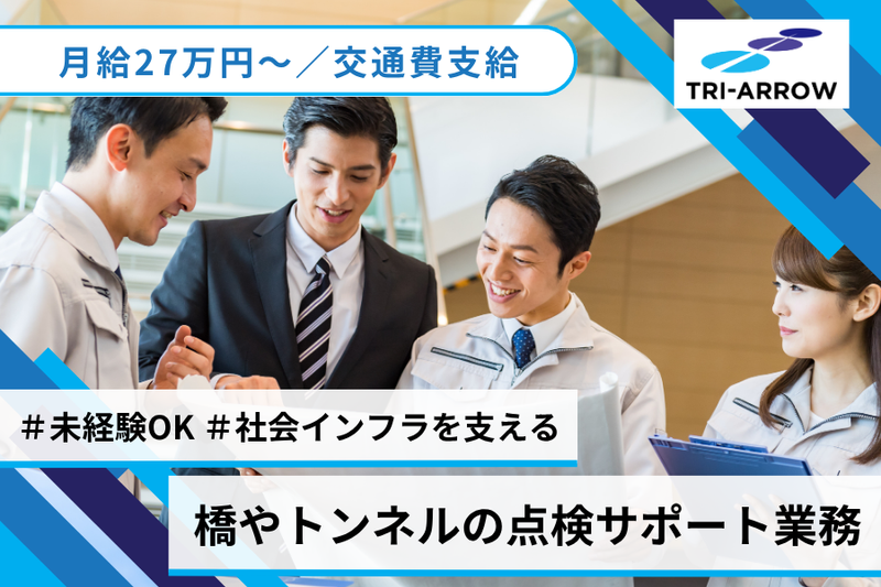 ■仕事内容 【業務内容】 道路や橋梁、トンネルといった“社会インフラ”を定期的に点検・確認するお仕事です。 点検業務とは…道路や橋梁、トンネルが安全に使い続けられるように、劣化や損傷がないかを定期的にチェックするお仕事です。 専用の高所作業車やゴンドラを使って橋の裏側や支柱部分を目視・計測で確認していきます。 チェックするのは、ひび割れ・さび・部材のゆがみなど。異常を見つけた場合は写真を撮り、報告書に記録します。 点検業務は、「人々の暮らしと命を守る」社会的にとても意義のある仕事ですので 点検を通じてインフラを支える誇りを感じられるやりがいのある現場です。 2~3名体制で各現場に行き経験豊富な先輩社員が常に指示を出してくれるため、未経験の方でも安心してスタートできます。 勤務開始後は先輩社員と一緒に現場に行き、実際に作業を行いながら点検業務や必要な知識を学んでいただきます。 【主な業務内容】 ・点検作業の補助 ・現場での写真撮影や計測作業のサポート ・点検後の報告書作成 ・チーム内での安全確認・声掛け・機材準備など 勤務開始後は上記の補助業務から始めていただき、徐々にできること増やしていっていただきます。 将来的には補助だけでなく、メインの点検作業も行っていただきます。 【募集人数】 3名 【勤務開始日】 即日 ※勤務開始日はご相談ください 【プロジェクト期間】 長期 勤務開始時期: 即日勤務可能 ■仕事の特徴 駅チカ・駅ナカ 即日勤務OK フルタイム歓迎 長期歓迎 学歴不問 未経験・初心者OK 経験者・有資格者歓迎 資格不問