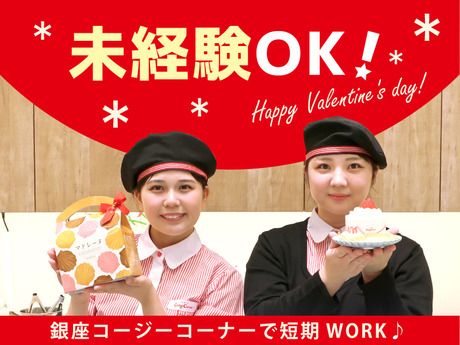 仕事内容 お仕事内容 お任せするのは… チョコレート等のバレンタイン限定商品を販売するお仕事! ・お客様からの注文受付、お会計、商品のお渡し ・簡単なラッピングや、商品の陳列・補充 ・お客様のご案内や清掃など シンプルな業務ばかりなので、 初めての方でもすぐに慣れて、楽しく働けますよ♪ サクッと働けるバレンタイン限定バイト☆ミ \短期集中で稼げる!/ やりがいと楽しさがギュッと詰まったお仕事です◎ 短期間で集中して効率よく働けるので、 毎年多くの方が応募されています。 人気のお仕事につき、ご応募はお早めに!! 短期アルバイトからスタートして、 そのまま長期アルバイトに移行する人もたくさん! 定着率抜群のお店なんです★ 店舗はバレンタインムード一色♪ 銀座コージーコーナーのバレンタインイベントを、 スタッフ全員で一緒に盛り上げます! 可愛いチョコレートや甘い香りのスイーツに囲まれながら、 楽しく働けるのはこの時期ならでは♪ 学生・主婦(夫)さん活躍中! 「春休みに向けてお金を貯めたい!」 「集中して効率よく稼ぎたい」 「長期のお仕事は難しい...」 そんな方にピッタリのバレンタイン時期限定バイトです★ ☆短期バイトを探している! ☆バレンタインの雰囲気を味わいたい! ☆春休みのスキマ時間を活かしたい! ☆チョコレート・スイーツが大好き! ☆未経験からバイトデビューしたい! ☆家計の足しにしたい! ☆趣味に使うお金を稼ぎたい! ☆雰囲気の良い・可愛いお店でバイトしたい! ◇◆未経験・ブランク歓迎◆◇ \未経験の方も大歓迎!/ 先輩たちが丁寧にフォローするので、初めてでも安心。 短期仲間もいるので心強いですよ♪ ▼こんな経験も活かせます ・洋菓子店、パン屋、コンビニやスーパーでの経験がある方 ・ベーカリー販売、スイーツ販売、物販などの販売スタッフ ・飲食店での経験がある方 ・アパレル、雑貨、コスメなどの接客販売経験のある方 ・事務、受付、コールセンターなどでの経験がある方