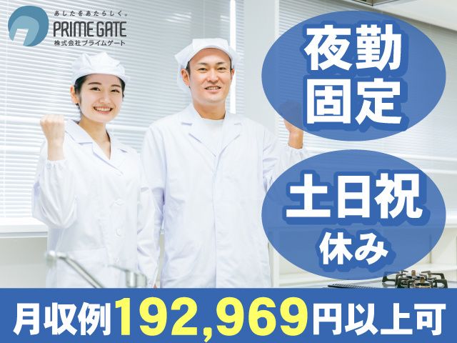 仕事内容 効率よく稼ぎたい方におすすめ! 夜勤固定の工場ワーク! 【注目ポイント】 ・勤務時間の選択OK ・22時以降は深夜割増時給 ・未経験OK ・幅広い世代活躍中 ・中高年・シニア活躍中 ・男女活躍中 ・即日勤務OK 食品工場で冷凍ハンバーグの製造に関するお仕事です。 具体的に以下の作業をお願いします。 ・網で焼かれてきたハンバーグの検品 →焼き目がちゃんとついているか?ひび割れがないか?などをチェック ・冷凍された真空パックの検品・箱詰め作業 ・その他、清掃や洗浄作業(翌2時以降) →「大きい機械の分解・ジェッターでの洗浄作業」「分解された細かい部品を手作業で洗浄する作業」があり、適性に合わせてご担当いただきます。 作業中は長靴・エプロンをご着用いただきます。 洗浄作業はお湯を使用します。 一度覚えてしまえば簡単な作業です。 工場ワークが未経験の方も始めやすいお仕事! 幅広い世代活躍中! 20代~60代、中高年やシニアの方も活躍中の職場です。 即日勤務OK! 作業着(衛生服)は無料でお貸しします。 職場見学も可能です! どうぞお気軽にお問合せください。 【プライムゲートで働くメリット】 ・担当者に相談しやすい関係作り 「何かあったら担当者に連絡してね」と言っても、連絡しづらいですよね。 当社の営業担当は、スタッフさんが相談しやすい関係を構築できるよう心掛けています! 職場での状況確認はもちろん、世間話なども! 気軽にお話ししています。 ・「働きやすさ」を最優先! 「仕事の内容は気になるけれど、お子さんを送り出してからだと出勤時間が合わない」 という場合はぜひご相談ください! 当社スタッフが勤務時間や条件などを勤務先と交渉します。 働き方に合わせてお仕事を紹介することもできますので、 「わがままかな」と思わずにぜひご相談ください。 ・担当スタッフがお仕事探しやスキルアップをサポート! お仕事情報はもちろん、スキルアップなどについてもご相談ください! ライフスタイルの変化や、働き方、持っている資格を活かせるお仕事など、 ご希望に合わせてお仕事の紹介をしております。 ・有休消化率73%、勤続年数平均2年6ヶ月、契約終了後の再就職率38.67%の実績 契約中も契約終了後も、ライフスタイルや経験に合わせて快適に働ける環境をバックアップします! 気になることやちょっとした質問も、ぜひお気軽にお問い合わせください。