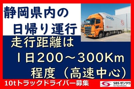 仕事内容 【今回私たちが募集しているお仕事は・・・】 スーパー(生協)などの店舗に冷蔵・冷凍食品や日用品を配送する10tトラックのドライバー。毎日決まったコースの配送をお願いしたいのです。 荷物は台車に載っていますので、手積みや手降ろしはありません。 今回、新しくコースが増える予定となりましたので、10tトラック経験者を募集することになりました。 【このお仕事の特徴は・・・】 ◆静岡県内の店舗配送業務(1日1~2店舗)です ◆走行距離は1日200~300Km程度(高速中心) ◆毎日同じルートでの配送で安心! ◆勤務曜日は固定曜日で週休2日!勤務曜日は面接時にご相談ください! ◆荷物は台車積みなので、面倒な手積み手降ろし作業は一切ありません! ◆運ぶものは冷凍・冷蔵食品や雑貨です ◆AM2:00出勤、深夜の運行開始です ◆日中の時間を活用でき、プライベートも充実! <お仕事の1日の流れは・・・こんな感じです> 2:00 沼津市内の支店に出勤、日常点検、点呼、配車確認 *積み込み無し 2:30 支店出発 3:30 静岡市駿河区の物流センター到着、積み込み開始 5:00 物流センター出発 6:00 静岡県内の配送先店舗到着、荷降ろし 7:00 配送先店舗出発 8:00 静岡市駿河区の物流センター到着、休憩 9:00 積み込み開始 10:00 物流センター出発 11:00 静岡県内の配送先店舗到着、荷降ろし 11:30 配送先店舗出発 13:00 沼津市内の支店に到着、点呼、業務終了、退勤 【ドライバーの年齢構成は・・・】 30代から60代が在籍しています。50代が一番多くて、ちょっと年齢層が高い穏やかな職場です。以前は女性ドライバーの方も勤務していました。 *昨年募集をした時は、4~50代の方が同時期に3名入社してくれました。 *現在、管理職1名、役職乗務員2名、乗務員23名が在籍しています。 【こんな方はいませんか?・・・】 ◆「泊り勤務が無いドライバーが良いな…」と思っている方 ◆「県内のみの運行が良いな…」と思っている方 ◆「固定曜日の週休2日が良いな…」と思っている方 ◆「深夜開始でも良いな…」と思っている方 ◆ご家族を安心させる為にも「大手の安定した企業が良いな…」と思っている方(東証プライム上場企業) ◆「静岡県で仕事がしたい…」と思っているU・Iターン就職希望の方(県内 固定ルートなので安心) ◆◆この先10年間の身体の事を考えてお仕事を探されている方◆◆ 【SBSゼンツウについて・・・】 SBSゼンツウは「物流を創造する会社(創造物流)」をビジョンに掲げている物流会社です。単に荷物を運ぶだけで終わりでは無く「もっと相手(お届け先)に喜ばれる(感動してもらう)にはどうやって運べば良いのか?考え(創造)ながら仕事をする」事を「創造物流」と表現しています。 ◆ 現場のYouTube動画です。ぜひご視聴ください! https://youtu.be/BOmaJBcAkpE?si=ObJUnXBMMV3r6IHN ◆創業以来、43年間右肩上がりの成長! ◆東証プライム上場!年商4300億円超え (日本の物流を支えるSBSグループの一員) ◆従業員の安全第一! ┗「働きやすい職場認証」「Gマーク」取得済! ┗ドライブレコーダー、衝突軽減ブレーキ完備 ┗当社において、衝突軽減ブレーキが装備されている大型車の保有が64%迄進んでいます。5年以内に100%を実現させ、安全を確保します。 ◆運行管理者資格などの資格取得支援制度あります。 ◆タブレットを利用した無線があります。 ◆動態管理アプリ(iGOQ)を導入していますので、通行止めなどで予期せぬルートを通る必要性がある時はiGOQで事務所常駐管理者がナビゲーションを行います。 ◆大手ならではの座学研修や同乗研修なども充実! 新人研修(座学):3日間 同乗研修:独り立ちされる迄 【支店長の縣(あがた)より】 当支店は、笑顔が絶えない職場です!年齢に関係なく、誰もが活躍できる環境です。 スタッフ同士の仲が良く、困ったことがあればすぐに相談できる雰囲気です。 仕事とプライベートの両立もバッチリ!充実した毎日を送りながら一緒に成長していきましょう!