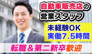 お仕事内容 【1週間以上休める大型連休あり】 夏期は9日間、冬期は7日間の大型連休! 贅沢にゆっくり過ごしたり旅行をしたり… リフレッシュできるメリハリ良い環境です 【三菱自動車ディーラーの販売営業】 お客様との会話を通して自動車を提案! 接客販売から契約、購入後のフォローまで お客様のカーライフのサポートをお任せ 【具体的には…】 ■ショールーム内での接客 ■車や保険の商談、契約 ■定期点検のご案内 など 【未経験OK!サポート体制が充実】 まずは笑顔で挨拶ができればOK! 先輩社員がOJTで丁寧にサポートします 未経験スタートの方もご安心ください 受動喫煙措置:屋内全面禁煙