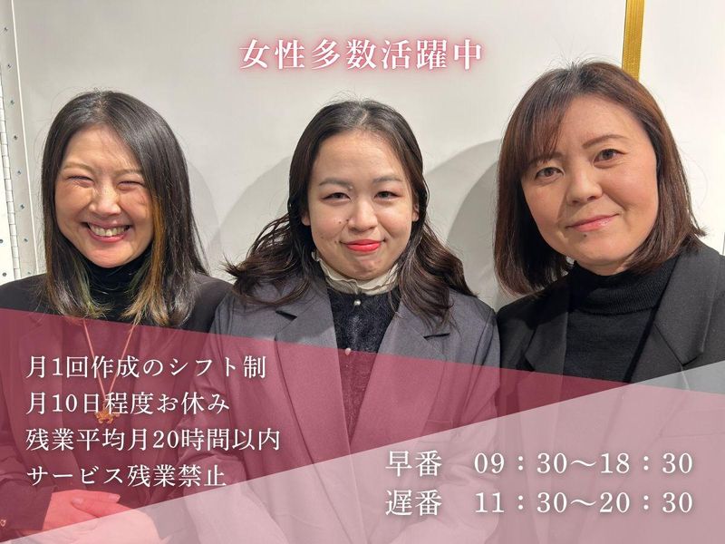 勤務時間詳細 実働時間:1日あたり7時間30分 平均勤務日数:1ヶ月あたり18日 〜 21日 ■残業月平均20時間以内 ■サービス残業禁止 (GPS勤怠アプリで防止) シフト制:月1作成 早番 09:30~18:30 遅番 11:30~20:30 同施設内に系列店舗あり 先輩店長やチーフがいるので安心