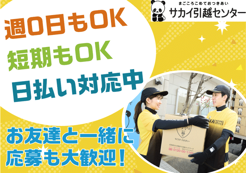 仕事内容 ─────────────── \シフト希望はスマホで申請/ ✅週0シフトもOK ✅1日4h~の時短OK ✅1ヶ月程度の短期もOK ✅年末年始限定の短期もOK ─────────────── サカイ引越センターにて 「引越アシスタント」を募集いたします。 ・台車を使っての運搬 ・軽い段ボールの持ち運び など 2~6名のチームで作業を行うので、 先輩や仲間がサポートしてくれます。 ─────────────── 友達同士での応募も大歓迎です✨ 初めてのアルバイトや ちょっとしたお小遣い稼ぎにオススメです!