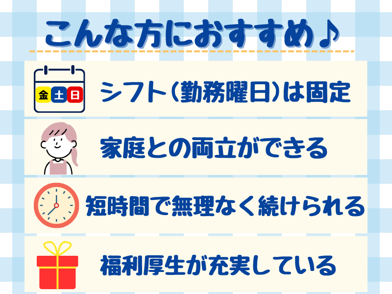 求めている人材 *未経験者大歓迎! *主婦(夫)さん、 副業・Wワーク(週40時間以上働いている方のWワーク不可)、 フリーターさんも歓迎です! *扶養内勤務もOK!ご相談ください。 / 週末だけ働きたい! リフレッシュ感覚で仕事がしたい! \ そんな思いを持った方歓迎♪ *久しぶりの社会復帰でブランクがある方、 家庭と両立して働ける職場を探していた方にもピッタリです。 【こんな方におすすめ!】 ●週末だけ働きたい主婦・主夫の方 ●家事や介護との両立を考えている方 ●自分の時間を持ちたいけど、外に出る理由がない方 ●収入も気分転換も両方欲しい方 ●人間関係で気疲れしない仕事を探している方