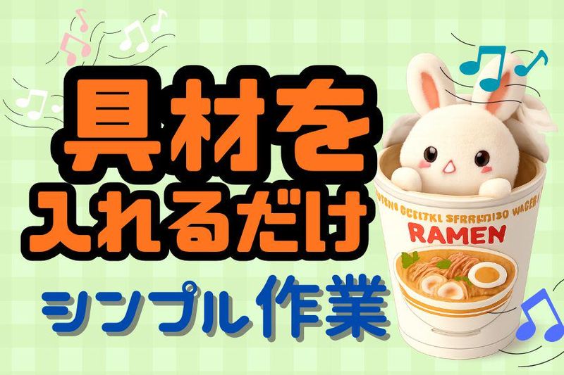 仕事内容 \インスタント食品の中身を入れるだけのシンプル作業/ インスタント麺に一緒に入っている具材袋・トッピング・調味袋などを容器の中へセットしていくお仕事。 商品ごとに入れるものは変わっても、作業の流れは共通。 初心者の方や異業種からの転職でも始めやすい内容です。 【具体的な業務内容】 ◆ 具材・調味袋のセット作業 → インスタント麺の容器に、決められた具材袋や調味袋を入れていきます → 商品ごとに内容は異なりますが、作業自体は同じ流れです ◆ トッピング投入作業 → 個包装されたトッピング類を容器にセット → 判断が必要な作業はなく、手順通りに進めます ◆ 作業後の片付け・清掃 → 機械や作業台、床などを清掃 → 小麦粉や麺くず、具材の欠片などを洗い流し、次の作業に備えます 【よくあるご質問(Q&A)】 Q. 工場で働いたことがなくても大丈夫ですか? A. もちろん大丈夫です。 作業内容はとてもシンプルなのでご安心ください。 異業種からスタートした方も多く活躍しています。 Q. 作業スピードについていけるか不安です。 A. 無理なスピードを求められる作業ではありません。落ち着いて作業できます。 Q. 重たいものを持つ作業はありますか? A. 重たい作業はありません。扱うのは軽量な具材や袋物が中心です。 Q. 職場の環境はどんな感じですか? A. 空調完備で清潔な工場です。 当然毎日清掃を行いますので、機械や作業場は常にきれいな状態が保たれています。 Q. 気をつけるべき食品アレルギーについて教えてください。 A. 工場内では小麦粉・そば粉を扱います。 その他気になる食品アレルギーがある場合は、まずはご相談ください。 アレルギーで難しい場合は、可能な限り他のお仕事をご案内させて頂きます。