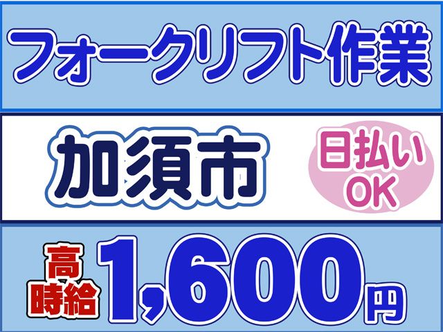 仕事内容 物流倉庫内でのフォークリフトのお仕事 高時給1,600円スタート 【フォークリフトスタッフのポイント】 〇定着率抜群で働きやすい職場 〇時給1,600円スタート 〇日勤のみ 〇土日祝休み 〇20代30代40代50代前半の男女活躍中 〇中高年活躍中 〇履歴書不要 〇日払いOK(規定内) 〇職場見学OK(30分~1時間程度) 〇「マイリク定着支援」導入企業! 【フォークリフトスタッフの仕事内容】 大手洗面化粧台やユニットバスを 取り扱う物流センターでフォークリフトによる 入出庫作業やピッキング作業をお願いします 資格×経験活かせる高時給◎ 職場見学(30分~1時間程度)を実施しております。 実際に作業内容を見てから決めていただけます! 【フォークリフトスタッフの勤務について】 〇土日祝休み(会社カレンダー) 〇日勤 ・08:00〜17:00 (実働8時間) ・09:00〜18:00 (実働8時間) 急な発熱・体調不良・冠婚葬祭など、 突発的なお休みに柔軟に対応しております。 【こんな経験活かせます!】 下記経験者は前職活かせます。 〇フォークリフトオペレーター 〇入出庫・出荷準備パート・アルバイト 〇工場内作業 〇軽作業パート・アルバイト 〇梱包・箱詰め・包装パート・アルバイト 〇倉庫内派遣 〇主婦・主夫パート(職種不問) 〇中高年パート 前職不問で採用しております。 ブランクある方もOK、経験の浅い方もOK 〇ご不明な点はお気軽にお問い合わせください〇 お電話でのご応募、ご質問も受付中! 株式会社ロフティー 白岡支店 担当営業、または採用担当まで TEL0800-222-6888(フリーダイヤル) お仕事情報など採用ページはこちら https://entori.jp/lofty-shiraoka コーディネーター・定着支援のWサポート体制導入 「マイリク定着支援」導入企業! アンケートで職場の様子を確認し、 コーディネーター・定着支援担当が連携してサポート。 はじめての派遣でも安心して働けるよう迅速かつ 丁寧にサポート対応いたします。
