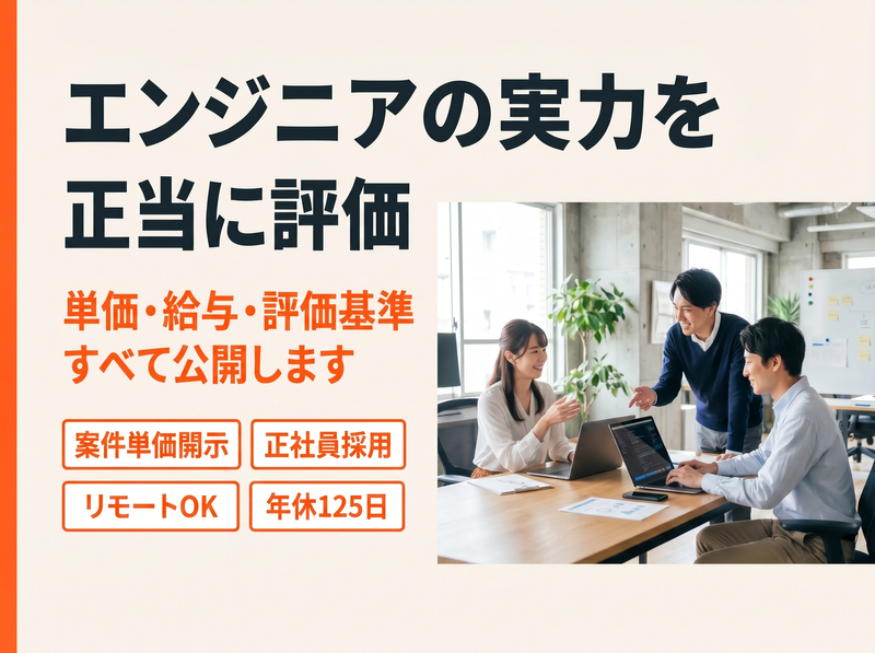 仕事内容 \ 単価も給与も“見える”環境 / \ 経験に見合う収入と働き方へ / ―――*―――*―――*―――*――― 【この求人のポイント】 ・還元率80%以上 業界トップクラスの高還元 ・案件単価・給与すべて開示 ブラックボックスなしの評価制度 ・案件選択制 希望に応じたアサインが可能 ・正社員採用 安定して長く働ける環境 「今の評価に納得できていない」方へ ━━━━━━━━━━━━━━━━━━━ 仕事内容 ━━━━━━━━━━━━━━━━━━━ 開発・インフラ案件にて、 ITエンジニアとしてご活躍いただきます。 <具体的には> ・要件定義、基本設計、詳細設計 ・開発、テスト ・運用保守 ・PM、PMO業務 経験や希望に応じて、 担当工程を選択可能です。 <プロジェクト例> ・基幹システム開発(Java/Spring Boot) ・Webサービス開発(Python/PHP) ・スマホアプリ開発(Kotlin/Swift) ・クラウド基盤構築(AWS/Azure) 開発・インフラ問わず、 幅広い案件をご用意しています。 ━━━━━━━━━━━━━━━━━━━ 働き方・特徴 ━━━━━━━━━━━━━━━━━━━ ・案件選択制 ・会社都合の一方的な配属ほぼなし ・直行直帰OK ・リモート併用案件あり 希望する働き方・スキルに応じて、 最適な案件を提案します。 ━━━━━━━━━━━━━━━━━━━ 評価・報酬 ━━━━━━━━━━━━━━━━━━━ ・還元率80%以上 ・案件単価・給与すべて開示 ・前給保証(総収入) ・待機期間中も給与100%支給 成果や単価に応じて、 収入アップを実現できます。 ━━━━━━━━━━━━━━━━━━━ 求める人材 ━━━━━━━━━━━━━━━━━━━ 【必須】 ・ITエンジニアとしての実務経験 (開発/インフラ/運用保守など分野不問) 【歓迎】 ・要件定義や設計など上流工程の経験 ・PM、PMO経験 ・複数言語、複数案件の経験 【こんな方に向いています】 ・単価や評価の仕組みが見える環境で働きたい ・今より収入を上げたい ・経験に見合った待遇を受けたい ・安定して長く働きたい ━━━━━━━━━━━━━━━━━━━ 会社について ━━━━━━━━━━━━━━━━━━━ 当社はテレビ番組制作・映像制作を基幹事業とし、 現在はITソリューション事業も拡大しています。 複数事業による安定基盤のもと、 エンジニアが安心して働ける環境づくりに注力。 SES業界で課題となっている 「評価の不透明さ」を解消するため、 還元率や単価の開示を徹底しています。 ━━━━━━━━━━━━━━━━━━━ 募集背景 ━━━━━━━━━━━━━━━━━━━ 事業拡大に伴い、 エンジニア採用を強化しています。 今後の組織拡大に向けて、 中核メンバーとして活躍いただける方を募集します。