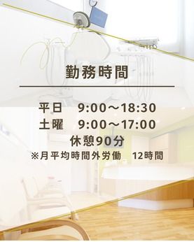 勤務時間 ・勤務曜日:月・火・木・金・土 ・勤務時間: [1] 09:00~18:30 [2] 09:00~17:00 平日 9:00~18:30 土曜 9:00~17:00 休憩90分