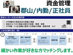 募集背景 業務拡大につき、各配置先の人員補強中です。 募集は随時受け付けており、次世代に繋げる人財の育成と運用体制の確立が目的となります。 仕事内容 資金管理員(資金センター内勤務:郡山市) 募集中 具体的には、店舗やATMなどに運ぶ現金を確認、管理する資金管理業務を実施しており、ALSOKの警備輸送事業において大きな役割を担っています。正確さと責任感が求められる仕事なので、みんなの気持ちをひとつにしたチームワークが大切です。男女を問わず活躍できる職場を整えております! 入社後は新任研修を受講して、必要な業務知識を習得していただいた後、数カ月のインターン教育を経てからの勤務となります。(ご希望により、職場見学も随時受け付けております!お気軽にお問い合わせください。) 【資金センター員の職務内容の一例】 資金センター員の1日の流れをご紹介します。 1.出社後、一日の予定を確認したのち、警備輸送隊員がATMに装填する現金や店舗等へお届けする釣銭の準備などを行う。 2.ATMから回収した現金の確認業務を済ませ、交代で休憩を取る。 3.保管する現金を整理。業務手順の改善点を見つけたため、上司と対応方法を検討。 4.データ上の金額と実際の現金に差異がないかをチェックし、一日の業務に不備がないことを確認。 5.一日の業務をまとめ、翌日のスケジュールを確認してから退社。 >> 希望のキャリアを目指せる職場!<< 一般警備員(資金センター員)としてスタートし、成長と能力によるキャリアUPにより、 次世代を担う会社の要として活躍が期待されます。学歴は問われず実力を重視します。 是非、お気軽にご応募ください!! (キャリアパスの一例) 1.警備職(資金センター員)⇔営業職 2.警備職(資金センター員)⇔技術職 3.技術職⇔営業職 キャリアや適性に応じて様々なフィールドで活躍できます! <このような方を大歓迎 します> ・社会貢献に興味がある方 ・真剣に仕事に取り組める方 ・自己管理ができる方 ・誠実さと使命感を備えている方 ・お客様と直接接する機会が多く、サービス業、接客業と言う認識で取り組める方 [醍醐味] 目に見えないサービスですが、お客様から高いニーズのあるお仕事内容です。 お客様の財産はもとより、安全・安心を守ることができる社会貢献が高いやりがいのあるお仕事です。 [こんな人が活躍] 当社では20代・30代のスタッフをはじめ、 中高年の方も活躍中です。 スキルアップを図る経験者から未経験者まで幅広い方々が活躍できます! 前職:軽作業、清掃、製造、工場、ドライバー、配送、農業、フォークリフト作業などの経験者が活躍中!