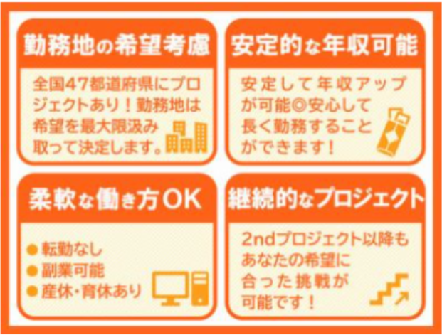 選考プロセス (1)Web履歴書による書類選考 (2)採用担当とのカジュアル面談 不安な点や気になる点など、ざっくばらんにお話しましょう。 勤務地や働き方のご要望をお伺いして、ご希望に添える形での配属を検討します。 (3)Web面接(1~2回を予定) *面接はWeb上で行います。 (4)内定 *ご応募から内定までは4週間以内を予定。 ご応募から1ヶ月以内の入社も可能です。 *面接日・入社日についてはご希望に応じます。 現職のご都合など、気兼ねなくご相談ください。