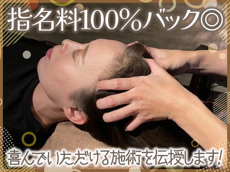 完全歩合制 給与詳細 完全歩合制 入社半年時給1,200円(45%歩合の計算で超えた場合は高い金額を採用) 半年以降は完全歩合(45%〜) 【給与例】 給与例 《収入例》 60分2610円 月23日出勤した場合 ※1日あたり60分×4人施術…10,440円/日 └10,440円/日 × 23日 = 24万120円~ + 指名料全額バック★