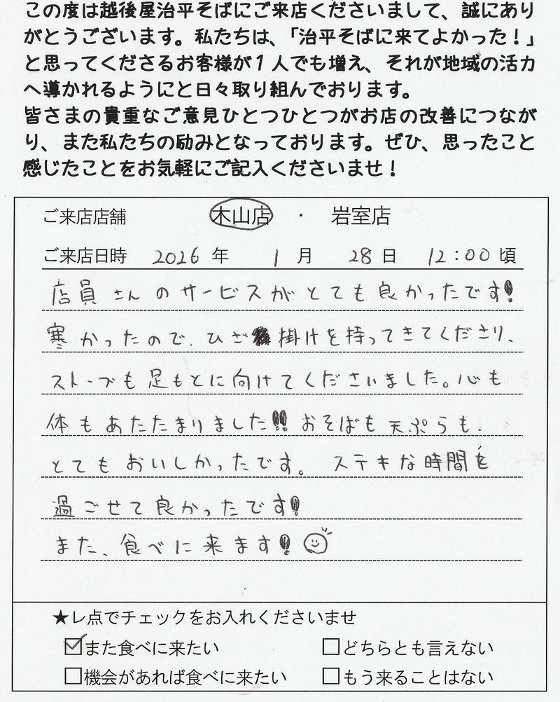 仕事内容 ⭐パートさんでもお店作りの主役に✨ 日替わりランチのメニューやプチデザートを みんなで考えてお客様に提供しています。 食材の発注やレジ〆、月末書類作成なども パートさんがやりがいを持って担っています! 主体性を持って楽しく取り組める環境です ⭐多種多様な業種からの転身者多数! 現在、30代6名・60代1名がメインで活躍中。 元美容師さん、元銀行員さん、 元クリーニング屋さんなど、飲食未経験から スタートしたスタッフばかりです! ⭐お客様とのコミュニケーションが活発! 基本、みんな飲食業が大好きなスタッフばかり。 キッチンメインですが、お客様との会話を 楽しむなど、温かい雰囲気が魅力のお店です ┏━━━━━━━┓ ◆ お仕事内容 ◆ ┗━━━━━━━┛ 越後屋治平そば木山店にて、 キッチン業務をメインにお任せします! 美味しいおそばとあなたの考えたメニューで、 お客様を笑顔にしてください⏩ ✅メインのキッチン業務 ⭐簡単な調理補助・野菜のカット ⭐蕎麦つゆ作り・薬味の準備 ⭐食洗機を使った洗い物(ラクラクです♪) ✅仕事に慣れてきたら… ⭐習熟度に応じて、オーダー取りや配膳など ホール業務も少しずつ覚えていただきます! お客様との会話もぜひ楽しんでください✨ ~~~ 働き方の例 ~~~ 【平日の場合】(※月に数回発生します) 11:00~17:00での勤務。 ※必ず毎回17時までではありませんが、 夕方までの勤務に対応できる方を求めています! 【土日祝の場合】(※半分以上出勤をお願いします) 10:00~14:00、または11:00~15:00の勤務。 週末は14〜15時頃に上がれるので、 夕方からは家族やお買い物など、 プライベートの時間にたっぷり使えますよ⏰ ┏━━━━━━━━┓ ◆ 働く環境 ◆ ┗━━━━━━━━┛ ✅ライフステージが変わっても安心! 現在30代スタッフが6名活躍していますが、 うち1名が育休中、さらに1名が5月末から 産休に入るなど、お互いに助け合える環境です👶 ✅困った時は社長が出動!? お子様の急な発熱などはみんなでカバー! どうしても人数が足りない時は、 スーパーサブとして社長が現場に出ます(笑) ✅:先輩スタッフの声(お料理好き・30代) ━━━━━━━━━━━━━━━━━ 「料理が好きでキッチン希望で入りました。 ここはただ裏方で作業するだけでなく、 日替わりメニューを考えさせてもらえるので 『自分たちでお店を作っている』という やりがいをすごく感じられますよ✨ ホールに出た時にお客様から直接 『美味しかったよ』と言われるのも嬉しいです」