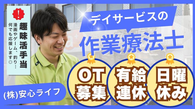 仕事内容 \ 「できた!」の喜びに、一番近くで / ⭐ 病院のその先へ。生活の場でのリハビリ ⭐ 日曜定休+GW・お盆・年末年始連休! ⭐ 有給消化率71.2%で実質年休123日も! ※年間休日114日+平均有給取得日数 ●=======●〇●=======● 「着替えが自分でできた」 「料理がまた作れた」 日常の何気ない「できた!」を支える。 それが、安心プラスの作業療法士の仕事です。 病院でのリハビリとの違いは、利用者様の 暮らしそのものに寄り添い、長期的な関係を 築きながら変化を見届けられること。 「その人らしい生活」を再建するプロとして、 あなたの専門性をここで活かしませんか? ●=======●〇●=======● ✅具体的なお仕事内容  ̄ ̄ ̄ ̄ ̄ ̄ ̄ ̄ ̄ ̄ ̄ ̄ ̄ ̄ ̄ ̄ ̄ ̄ ̄ ̄ デイサービス「安心プラス」にて、 心身機能の維持・向上のための訓練を担当します。 ▼ 日常生活動作(ADL)の訓練 着替え、食事、トイレ動作など、 生活に 直結する動作の練習や指導を行います。 ▼ 作業活動・レクリエーション 手工芸、園芸、ゲーム等を通じて、 楽しみながら 心身機能の維持を図るプログラムを運営します。 ▼ 認知機能訓練・環境調整 脳トレなどの支援や、ご家族・スタッフへ 「暮らしやすい環境づくり」の助言を行います。 ※タブレット完備で、記録待ちナシ!