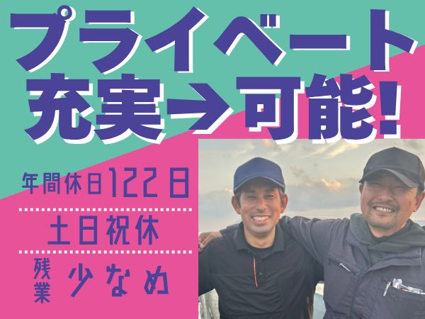 【保険制度】 雇用保険、労災保険、健康保険、厚生年金 待遇・福利厚生 【福利厚生】 ・国内外旅行補助金制度 海外:年1回3万円まで、国内:年5回5万円まで ・非喫煙者手当(非喫煙者には月3,000円支給) ・アニバーサリー祝金(年1回1万円支給) ・スポーツ推進手当 ・作業着貸与 ・服装自由 ・交通費支給 ・入社祝い金(在籍期間に応じて規定あり) -入社1ヶ月以上:5万円 -入社1年以上 :10万円 -入社2年以上 :20万円 (例:2年以上を選択→2年以上在籍で20万円支給)