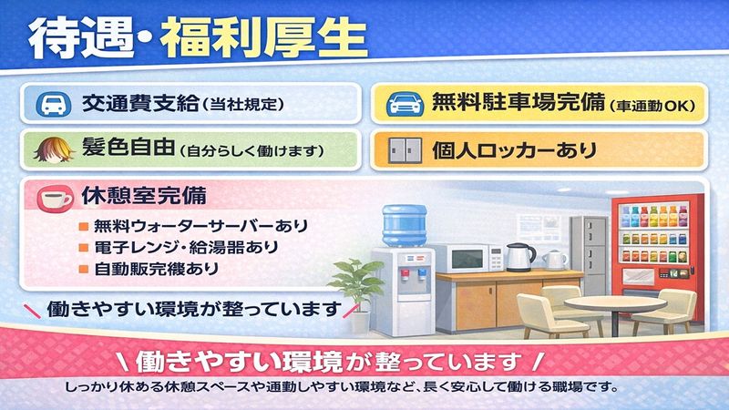 アピールポイント: 【未経験から始めた先輩が多数】 * 現在活躍している当社スタッフの9割以上の方が未経験からスタートしています! * 分からないことがあればすぐに周りの先輩がサポートしてくれる職場です。 【働きやすい環境が自慢】 * 当社から幅広い年齢の方々が勤務しております♪ * 休憩室には給湯器や電子レンジ、自動販売機を完備。 * 当社の専任担当者がついているので、困ったことがあればいつでも相談できる体制です。