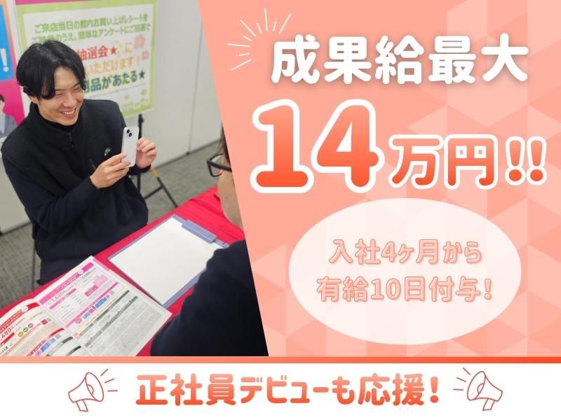仕事内容 ✅話すことが好きな方に◎ ✅週3日休み希望も応相談 ✅成果給などで月最大14万円のプラス ✅入社4ヶ月~有給10日付与&消化率100% ✅This job requires at least N1 level Japanese proficiency. ✼••┈┈┈┈┈┈┈┈┈┈┈┈┈┈••✼ 東海トップクラスのシェアを誇る! KDDI専売店 ✼••┈┈┈┈┈┈┈┈┈┈┈┈┈┈••✼ KDDIと強固なパートナーシップを持ち、 東海エリアで安定した成長を 続けている当社。 業界大手ならではの安定感と、 スタッフ一人ひとりを大切にする 柔軟な社風が魅力です。 【仕事内容】 ショッピングモールや商業施設で開催される イベント会場にて、 お客様への声かけをお願いします。 まずは、笑顔でチラシやティッシュを 配りながら興味を引き、 ヒアリングとご案内を実施。 慣れてきたら、契約などの クロージング業務へとステップアップ。 KDDI専売店ならではのブランド力と イベントの集客力があり、 成果も上がりやすい環境です。 <具体的には・・・> ・イベント会場でのティッシュ・ チラシ配布による 集客活動 ・くじ引きやビンゴ大会を活用した お客様の呼び込み ・携帯や通信サービスに関する 簡単なヒアリング ・サービス内容の説明や、着座への誘導 ・慣れてきたらクロージング業務 (営業提案・契約手続き) ・KDDI関連資格の取得によるスキルアップ 【想定される1日のスケジュール】 10:00 イベント会場集合・設営・朝礼 10:30 イベントスタート、 キャッチ業務開始 12:00 昼休憩(60分) 13:00 午後のキャッチ・クロージング業務 15:00 ビンゴ大会など企画タイム 16:00 営業スタッフによるクロージング (提案・契約) 19:00 業務終了・片付け・解散 ⭐イベント初挑戦でも安心の研修体制  ̄ ̄ ̄ ̄ ̄ ̄ ̄ ̄ ̄ ̄ ̄ ̄ ̄ ̄ ̄ ̄ ̄ ̄ ̄ ̄ イベント業務が初めてでも大丈夫! 入社後は毎週木曜日に開催される 本社研修(月3回程度)で、 キャッチの基本から接客マインド、 サービス知識まで丁寧に学べます。 ロープレ形式の実践練習で、 声かけのタイミングや会話の流れも しっかりマスターできるので、 自信を持って現場デビューできますよ。 ⭐体力に自信がない方も安心して働ける  ̄ ̄ ̄ ̄ ̄ ̄ ̄ ̄ ̄ ̄ ̄ ̄ ̄ ̄ ̄ ̄ ̄ ̄ ̄ ̄ イベント会場では立ち仕事が中心ですが、 無理なく働けるようシフトや休憩体制も しっかり整備。 3日に1日はお休みという働き方が基本で、 しっかりリフレッシュしながら働けます。 こまめな体調管理を行いながら、 チームで支え合える風土が根付いています。 ⭐頑張りが「収入」に直結するやりがい  ̄ ̄ ̄ ̄ ̄ ̄ ̄ ̄ ̄ ̄ ̄ ̄ ̄ ̄ ̄ ̄ ̄ ̄ ̄ ̄ イベントスタッフは、 通常の店舗スタッフよりも 成果給の幅が大きく、 インセンティブは月最大14万円。 さらに、KDDIの資格を取得すると 月最大2.5万円の手当も支給されます。 「しっかり稼ぎたい」 「自分の努力を正当に評価してほしい」 そんな方にぴったりの環境です。 結果が出れば収入にも反映されるため、 やりがいを持って働けます。 ⭐キャリアアップも明確&着実  ̄ ̄ ̄ ̄ ̄ ̄ ̄ ̄ ̄ ̄ ̄ ̄ ̄ ̄ ̄ ̄ ̄ ̄ ̄ ̄ 昇格すれば、 基本給も192,000円から 最大239,000円にUP。 さらに、リーダーや ネジメントポジション、 教育・販促などの本部業務へのステップも 用意されています。 「現場で経験を積んだ先に何があるのか」 明確に見えるから、 長く働ける安心感があります。