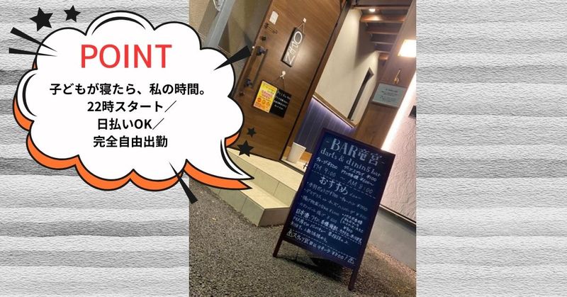 アピールポイント: ✅ 時給1,600円~で効率よく稼げる 日払い・週払いにも対応。急な出費にも困りません。 ✅ 完全自由出勤──シフト提出すら不要 「今日出たい」の当日連絡でOK。週1でも週5でも自分のペースで。 育児中のママさんやWワーカーも無理なく働けます。 ✅ おしゃれ自由!髪色・ネイル・ピアス・私服OK ありのままの自分で出勤できます。 バイトのために見た目を変える必要ナシ。 ✅ 未経験OK!お酒の知識ゼロからスタートできます 少人数のアットホームなお店だから、丁寧に教えてもらえる環境。 バーテンダー経験がなくても大丈夫です。 ✅ 遊び感覚で働ける!「楽しんでたらバイト時間が終わってた」──そんな職場です。 ✅ 頑張りはしっかり還元。昇給制度あり 続けるほど時給UP。長く働くメリットもしっかりあります。 ✅ 友達同士の応募も歓迎! 一人が不安な方も、友達と一緒にスタートできます。
