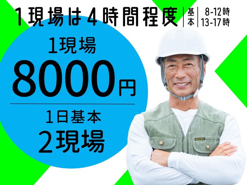 固定時間制 勤務時間詳細 実働時間:1日あたり4時間 〜 8時間 平均勤務日数:1ヶ月あたり4日 〜 20日 【勤務時間】 8:00~12:00/13:00~17:00 ◆現場により変動する場合あり ◆1日に基本2現場を対応 ◆1現場にかかる時間は4時間程度 \早く終わっても勤務終了でOK!/ 早く終わる際は 2現場以上をお願いする場合もあります。 現場単位で給与が発生するので しっかり稼ぎたい方にも最適な環境です! 「1現場のみの勤務を希望」 「稼ぎたいから3現場入りたい」などの相談もOK! 【勤務日数】 週1日~勤務OK >>自由に働けます!<< 土日のみOK/平日休みOK 平日のみOK/土日祝休みOK