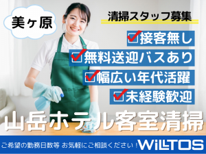 インフォメーション 無料送迎あり◎自然に囲まれたリゾートホテルで働く客室清掃の仕事です! 【おすすめポイント】 ◎ 無料送迎あり(松本駅・島立など複数ルート) ◎ 高時給1,650?1,950円 ◎ 週4?5日働ける方にピッタリ ◎ 未経験スタートのスタッフが多数! ◎ 自然の中で気持ちよく働けるリゾート環境 ~~~~~~~~~~~~~~~~~~~~~~~~ 電話での応募もOK!!お気軽にご連絡ください。 応募受付TEL 0120-160-086 ~~~~~~~~~~~~~~~~~~~~~~~~ アピールポイント +…………………………………………………………………+ 送迎ありで通勤ラクラク◎高時給のホテル清掃です +…………………………………………………………………+ ★未経験スタート多数 90%以上が未経験からのスタート。 研修も丁寧で、安心して続けられます。 ★チームで働ける安心環境 仕上がり確認や分担作業など、1人に負担が偏りません。 ★生活リズムが整いやすい 昼間の時間帯なので、お子さんやご家族の予定と両立できます。 ★自然に囲まれた環境 四季の景色を感じながら働けます。送迎バスでも癒されます。