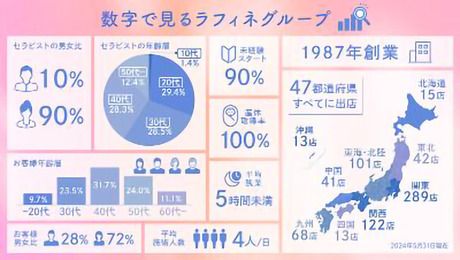 職場環境 【従業員構成】 【業界トップクラス】★Raffine Group 全国750店舗以上! □47都道府県すべてに店舗あり! □各店舗駅チカ!通いやすい商業施設♪ □U・Iターン歓迎! □毎月2~3店舗、新たな店舗を全国でオープンしています!!オープニングスタッフとして働ける店舗も多数♪ 【職場の雰囲気】 落ち着いた職場 立ち仕事 お客様との対話は多い 長く働ける