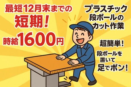 仕事内容 <高時給1,600円>超かんたん♪誰でもできる軽作業! 【段ボールを置いて、足でポン!】これだけ! ★30分でマスターできる単純作業! 「ラクな仕事がいい」「初めてでもできる仕事がいい」 そんなあなたにピッタリ! 工場でのお仕事といっても、やることはとってもシンプル♪ \お願いするのはこれだけ!/ ◎プラスチック段ボールを機械にセット ◎足元のペダルをポンと踏んでカット ◎カットされた部材をまとめて終了! 覚えるのに時間はかかりません! 「たった30分で覚えられた」というスタッフの声も♪ ※40歳くらいまでの男性活躍中! 【ここがポイント】 ・かんたん軽作業 ・モクモクできる単純作業 ・未経験・ブランクOK ・コツコツ作業が好きな方歓迎♪ \工場デビューにもおすすめです/ 「力に自信がなくてもOK」な、ラクちん軽作業始めませんか?