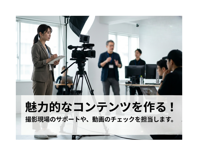 仕事内容: 企業の採用活動を支える、Instagram運用・ショート動画・オウンドメディア運用に関わる採用広報ディレクターのアシスタント業務をお任せします。 主に、企業の魅力を求職者へ伝えるためのコンテンツ制作・運用支援に携わっていただきます。撮影現場での進行サポートや、投稿物(画像・動画)の確認、レポート補助など、ディレクターの近くで幅広くサポートしていただくポジションです。 <お願いしたいこと> ■ディレクション業務 ・撮影同行 ・現場での簡単な調整進行管理 ・顧客対応 ・リール動画、フィード画像のチェック ・修正発注 ■アシスタント業務 ・レポート作成補助 ・市場リサーチ ・投稿予約サポート