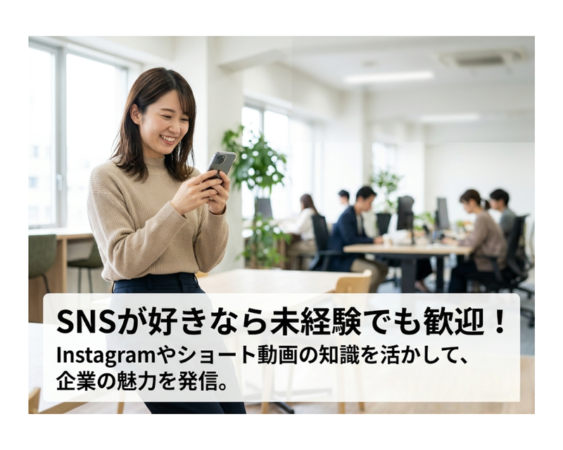 求める人材: ・営業経験がある方 ・飲食店、アパレルなどで接客経験がある方 ・最低限のビジネスマナーがある方 ・コミュニケーション能力がある方 ・段取りを考えて行動できる方 歓迎するタイプ ・SNSを見ることや発信することが好きな方 ・Instagramやショート動画に興味がある方 ・人と関わることが好きな方 ・サポート業務が得意な方 ・採用や広報の仕事に興味がある方