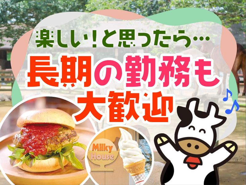 仕事内容 **************************** 成田ゆめ牧場の運営staff募集! お客様の「楽しい!」をお手伝い♪ 友達と一緒の応募も大歓迎です◎ **************************** 牧場の運営補助のお仕事です! [具体的には] ■施設内の売店/遊戯施設 お客様案内や簡単なレジ対応などを お任せします! ■飲食施設/キッチンカー 調理補助やドリンク作成、提供、 レジ対応などをお任せします! ■動物ふれあい イベントの補助、ふれあい場での お客様案内などをお任せします! ■体験イベント 楽しいミルクアイス作りなどの、 イベント運営補助をお任せします! ∟イベント用の器具の準備や食洗 ∟お客様のサポートなど ■施設内の清掃/ゴミ回収 成田ゆめ牧場内とキャンプ場の ゴミ回収、分別などをお任せします! ■セントラルキッチン 臨時売店で販売する商品の仕込みを お任せします! いろいろなお仕事の中から、 希望と経験を考慮して配属先を決定します。