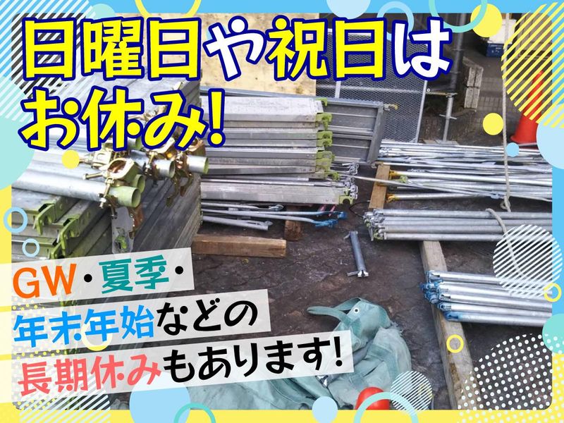 仕事内容 【 異業種からの転職や初めての就職の方も歓迎です!とび職人募集 !】 イチから新たなチャレンジをしたい方を応援します! 建設現場での作業を行う全ての足場工事を行っております。 一軒家・ビル・マンション・大型施設など、 当社ではどんな現場でも、ありとあらゆる建物の足場組立ができる技術を持っているので 各所から声がかかり業績も好調です! 高収入を目指せる!やればやるだけガッツリ稼げます! 年齢経験は問いません!やる気重視!! 足場はしんどい仕事だと思われていますが、やってみると達成感があり、現場の技術力もあがります! まずはやってみたいと気持ちがある方大歓迎です! ビルやマンション建設に欠かせない仕事なので、需要も高く安定しています。 一生の技術も習得できます!!様々な建設現場での足場の組立や解体をみんなで一緒になって進めていきます! チームプレーなので、初めての方でも安心です◎ 代表も元々、全くの未経験!1人前になるまでは親身になって教育します! 新人さんを1人にしておけないスタッフばかりだから、イチから丁寧に教えていきますよ。 分からないことはドンドン聞いてください! 挑戦したい気持ちをシッカリ応援していきますよ! もちろん経験者の方も歓迎です! 即戦力として活躍して頂ける環境です! ◎車通勤OK! 宝塚・伊丹・西宮・川西・芦屋・豊中などからも通いやすいです! 日曜日・祝日はお休み◎プライベートを充実させたりや家族と一緒に過ごせます! ◎暑さ対策としてこまめな水分補給や休憩をとるようにしています。