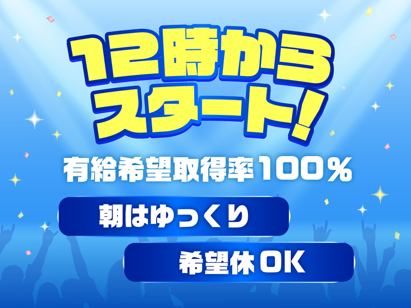 勤務時間詳細 [1]12:00~21:00(休憩60分・実働8時間) ※シフトは月3日までお休み希望提出OK!