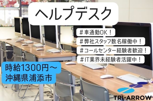 ■仕事内容 浦添市のIT企業にて、サービス業企業が使用しているGoogleWorkSpaceや PC操作、周辺機器、ネットワーク環境についてのヘルプデスク業務をお願いします。 ※弊社社員も活躍中! 【主な業務内容】 ・サポート先業務の社員向けにIT周りやGWSの利用方法に関する問い合わせ対応 ・パスワードのリセットといった緊急時の対応 ・PCの故障や障害に対しての受付、検証、解決策の提示 ・HPの更新代行作業 ・資料作成 など 対応マニュアル・対応履歴あります。分からないことは先輩社員になんでも聞ける環境です。 社内OJTとしてeラーニングもございますので、知識が無い方もご安心ください。 また、資格取得のサポートやIT基礎知識のツールについても提供いたします。 基本は出社となりますが、週2~3日程度は在宅・リモートワークも可能です。 【開始時期】 2025年10月スタート 勤務開始時期: 即日勤務可能 ■仕事の特徴 車通勤OK 服装自由 即日勤務OK フルタイム歓迎 長期歓迎 リモートワークOK 学歴不問 未経験・初心者OK 資格不問