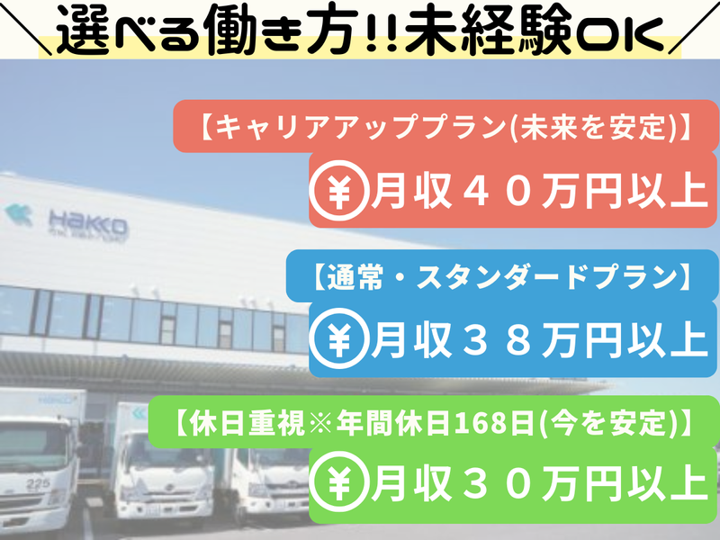 仕事内容 <選べる3パターンの働き方!> ◤ルートサービスキャリアコース◢ 月収409,921円 年間休日108日 ◤通常コース◢ 月収385,220円 年間休日120日 ◤休日重視コース◢ 月収304,590円 年間休日168日 ★内訳や詳細は給与欄を確認お願いします! -:+:-:+:-:+:-:+:-:+:-:+:-:+:- 中型トラックを使用した、 (※平成19年6月以前の普通免許でOK) リネン製品のルート配送・回収業務をお願いします! 【主な業務】  ̄ ̄ ̄ ̄ ̄ ̄ ̄ ̄ ̄ ̄ ̄ ̄ ̄ ̄ ̄ ̄ ̄ ̄ ✅ホテルで使用するシーツやタオル等のリネンの納品 ✅使用済み商品の回収 ◆ルート・訪問先は固定なので覚えやすくなっています ◆未経験でも始めやすい! 丁寧な研修・引継ぎで 安心して始められます。 ◆20~40代の若手スタッフや 中堅スタッフ中心に活躍中! ◆運転するのは中型トラック (旧普通免許でもOK) 【白興グループについて】 - 創業60年以上。 リネンサプライをはじめ、 多様なサービスを展開する安定企業です。 私たちは 「ルートサービスの顧客対応力で業界No.1を目指す!」 を掲げ、“ただ運ぶ”だけでなく、 対応力のあるサービスを大切にしています。 【POINT|働く魅力が満載!】 - ⚡ 年間休日108日~168日! 働き方に応じて休日数が選べる! 「休む時はしっかり休む」 メリハリ重視の環境です。 ⚡ 日勤のみ/固定シフト 朝は少し早めのスタートですが、 夕方前にはお仕事終了! 家族との時間や趣味も充実◎ ⚡ 働き方が選べる【3プラン】 ✅キャリアアッププラン(未来を安定) 『もっと稼ぎたい!』『いますぐ稼ぎたい!』方向けのプラン ルートサービスの仕事をしながら将来は管理職を目指すコースです。 安定した収入と成長を目指せます。 ✅通常スタンダードプラン 年間休日120日 月10日休み 評価制度があり、高ランク者は別途手当が支給されます(年間最大60万円) バランス重視で働きながらスキルアップ。 ✅休日重視プラン(今を安定) 年間休日最大168日! プライベートを大切にしたい方に◎ 職場見学もOK! まずはお気軽にご応募ください♪ 「ちょっと気になる」 だけでも大歓迎です!