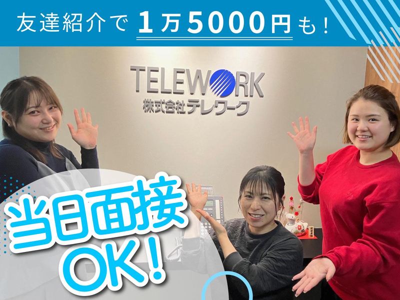 仕事内容 推し活全力応援! 「現場第一主義」で 働けるコールセンター! 「次のコンサートのために稼がなきゃ… でも、オシャレも諦めたくないし、 連休も取りづらいのは無理!」 そんな悩み、ここで解決しませんか? 株式会社テレワークは、 あなたの「好き」を全力で応援します。 ✨テレワークの3つの魅力✨ 1. 「現場仕様」のままで出勤OK! - コンサート前の気合を入れたネイルも、 現場仕様の髪色も、すべて自由です。 ✅オシャレ完全自由 ネイル・髪色・髪型・ピアス全部OK! ✅服装自由 現場用に買った服でお仕事可! ✅自分らしさ重視 職場のためにオシャレを 我慢する必要はありません。 2. チケット代を効率よく稼ぐ高時給 - 遠征費もグッズ代も、 時給1500円なら 少し余裕を持って準備できます。 ✅1分単位の給与計算 「1分たりとも無駄にしない」精神で、 働いた分は全額還元。 ✅面接特典 交通費として QUOカード500円分プレゼント 当日のカフェ代にしてください♪ 3. 「遠征・連休」大歓迎のシフト制 - 似た境遇の仲間が多いので 休み希望が通りやすいんです。 ✅コンサート優先OK 「この期間は遠征なので休みます」もOK! 周りのスタッフが 似た境遇の仲間が多いので 支え合ってお休みを取っています! ✅残業ほぼなし 配信やSNS巡回の時間もしっかり確保。 ✅週30時間〜 ガッツリ稼ぎたい時はロングで、 現場がある時は調整して、 と柔軟に組めます。 ⏩お仕事内容 - 受信メインで省エネ勤務 座り仕事&受信メインで ストレスなく働けます。 ✅お電話を受ける 修理や予約の受付など、 マニュアルに沿ってヒアリング。 ✅PCに入力 決まったフォーマットに ポチポチ入力するだけ。 ✅未経験でも安心! 約2週間の丁寧な研修があるから、 オフィスワークデビューでも大丈夫。 ノルマもないので、 数字に追われてメンタルを 削られることもありません。