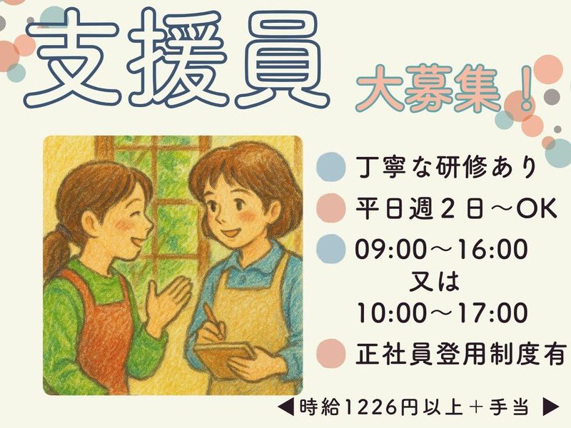 仕事内容 \子育てや家事と両立しながら働ける♪/ 障がい者デイサービス支援スタッフ募集! 「子育てしながら社会とつながりたい」 「資格はないけど福祉の仕事に興味がある」 そんなあなたを全力で応援する職場です! ■仕事内容 障がいのある利用者様の1日をサポートするお仕事です。 まずは「お話し相手になる」ことからスタート! 特別な資格や経験よりも、“人と人とのあたたかな関わり”が大切なお仕事です。 ■職場の魅力 ✔ 子育て・介護・家事と両立して働くスタッフ多数在籍! ✔ 急なお休みにも理解ある環境! ✔ 小さなお子さんがいるママさんも多数活躍中♪ ✔ 見学・お試し勤務OKで未経験でも安心! ✔ キャリアアップ制度あり◎ あなたのペースで勤務日数を増やしたり、 ゆくゆくは契約社員・正社員・介護福祉士の取得も目指せます! ■働きやすさもバッチリ! ・勤務時間 09:00〜16:00(残業・早出なし) 10:00〜17:00(残業・早出なし) → 保育園の送り迎えにも十分間に合います◎ ・小平駅から徒歩通勤OK/車通勤も可能(駐車場完備) ・20代〜30代の若手や男性職員も活躍中! 風通しがよく、相談しやすい環境です。